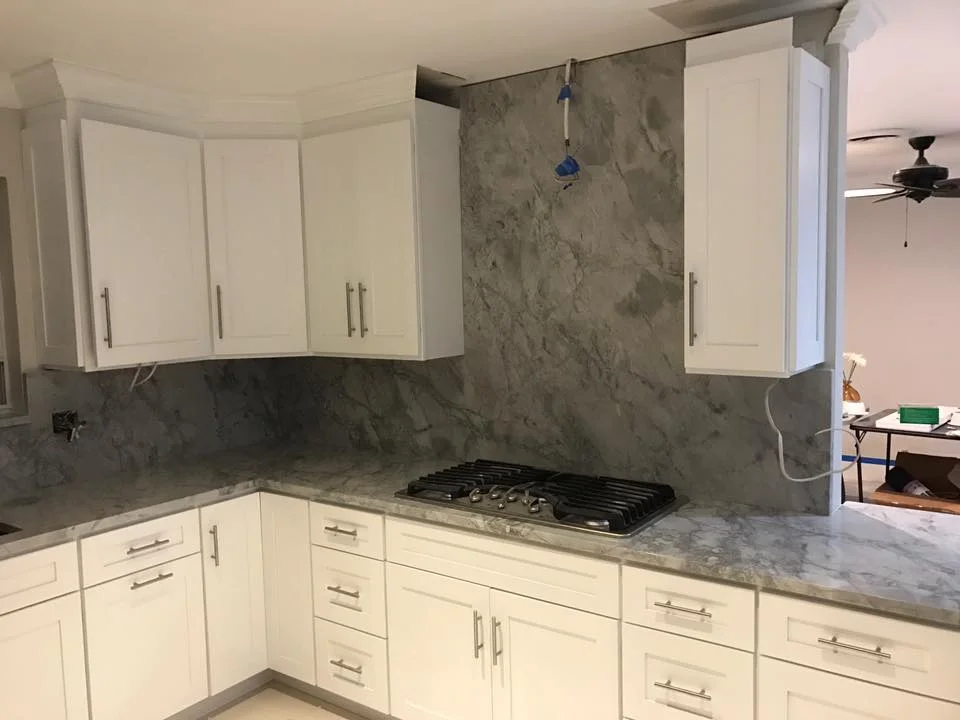 Super White quartzite with 2 waterfalls and full backsplash on white shaker cabinets